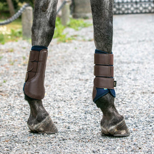 Flexible Gamaschen aus 3D Netzmaterial, mit einer stoßdämpfenden und druckverteilenden Polsterung zum Schutz der Pferdebeine vor Stößen und Verletzungen durch äußere Einwirkung. Die Gamasche ist maximal atmungsaktiv um Überhitzung zu vermeiden. Verstärkte Klettverschlüsse sorgen für eine ideale Passform. Das stilvolle Design zeichnet sich durch Kunstlederüberzüge am Ende der Riemen und über der Polsterung aus.