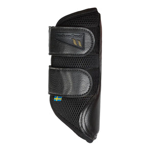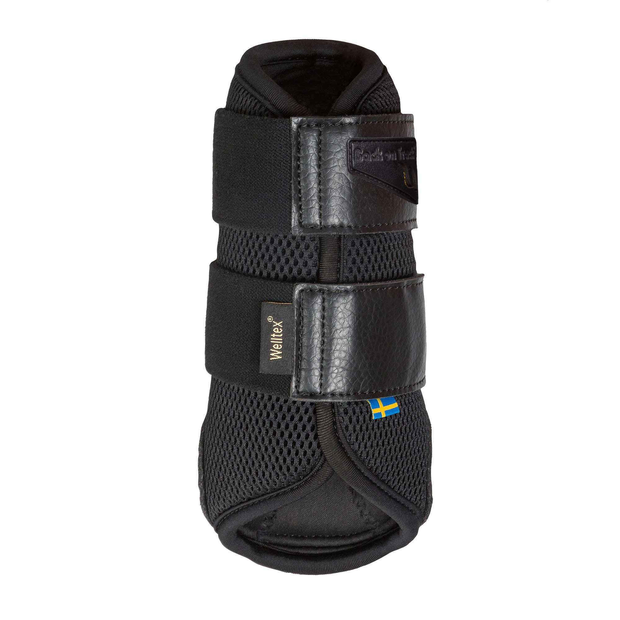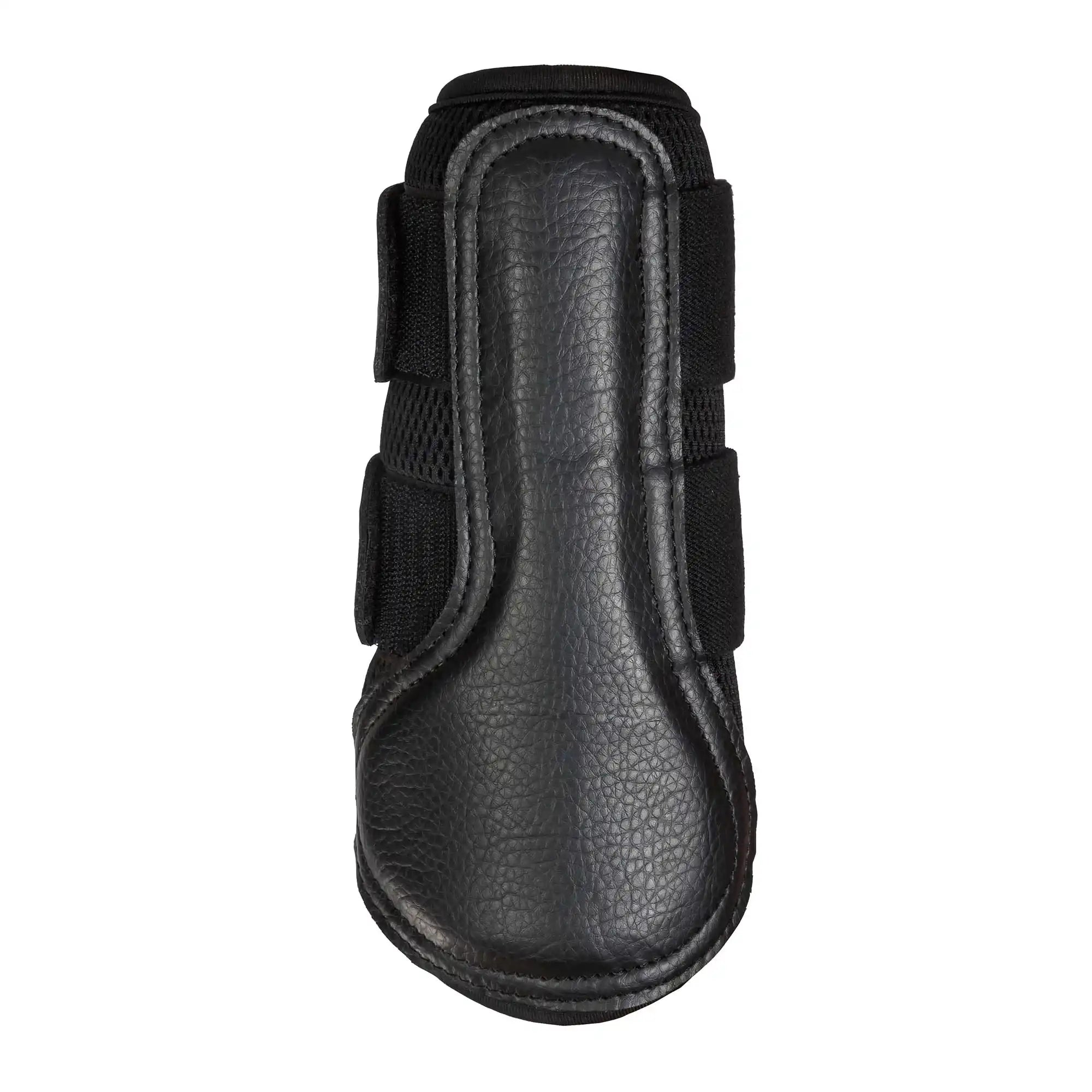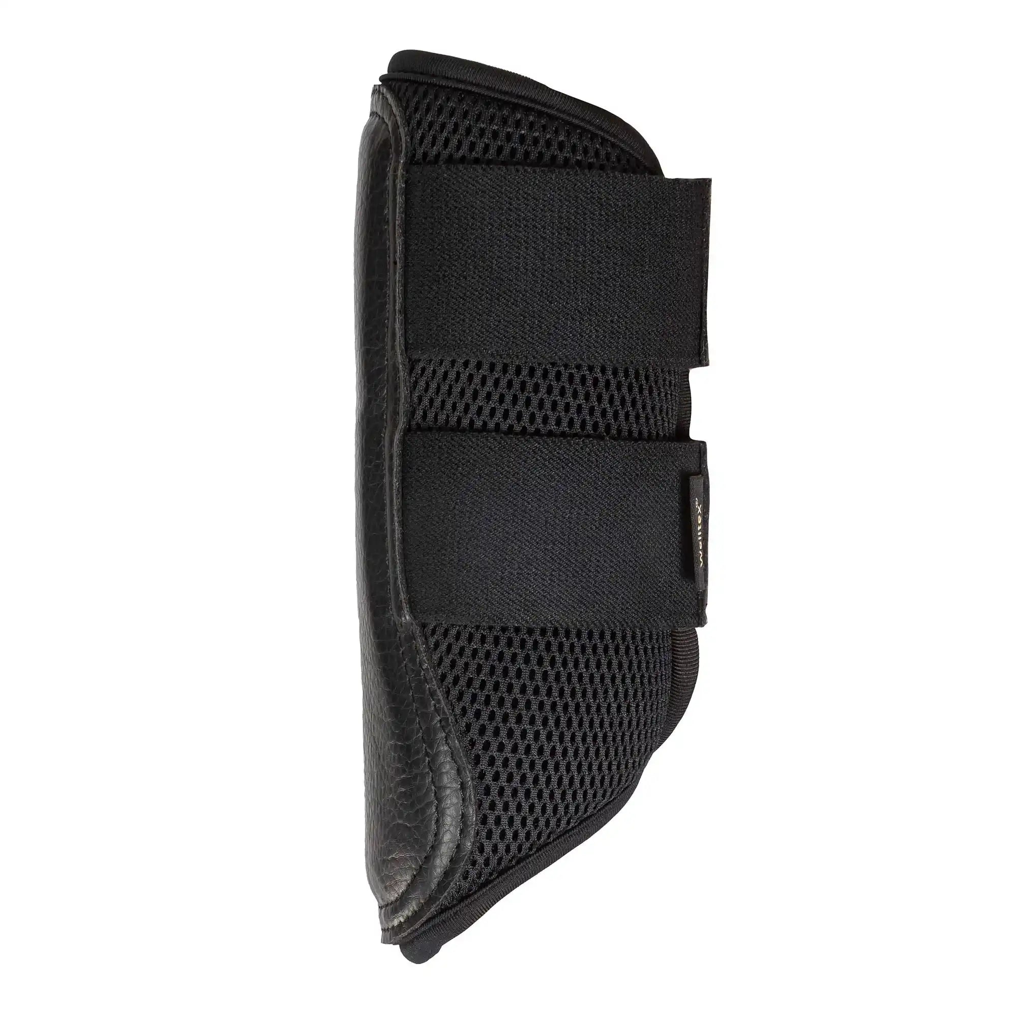 Flexible Gamaschen aus 3D Netzmaterial, mit einer stoßdämpfenden und druckverteilenden Polsterung zum Schutz der Pferdebeine vor Stößen und Verletzungen durch äußere Einwirkung. Die Gamasche ist maximal atmungsaktiv um Überhitzung zu vermeiden. Verstärkte Klettverschlüsse sorgen für eine ideale Passform. Das stilvolle Design zeichnet sich durch Kunstlederüberzüge am Ende der Riemen und über der Polsterung aus.